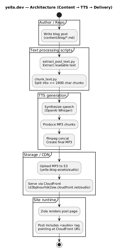 The architecture is straight-forward with separation of responsibility handled by different entities. For example, Publishing happens locally and then pushed to GitHub repository. A GitHub CI workflow extracts text from new article, and converts it into audio using OpenAI Whisper API, then upload to S3. Finally, there is a cache invalidation step that resets the blog static assets like images and audio to serve fresh content. This is invalidating all at the moment, but can be optimized further.